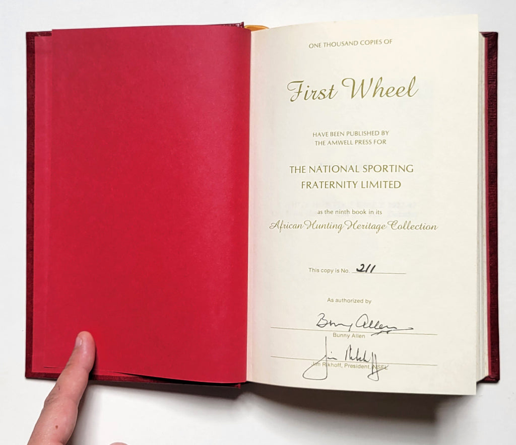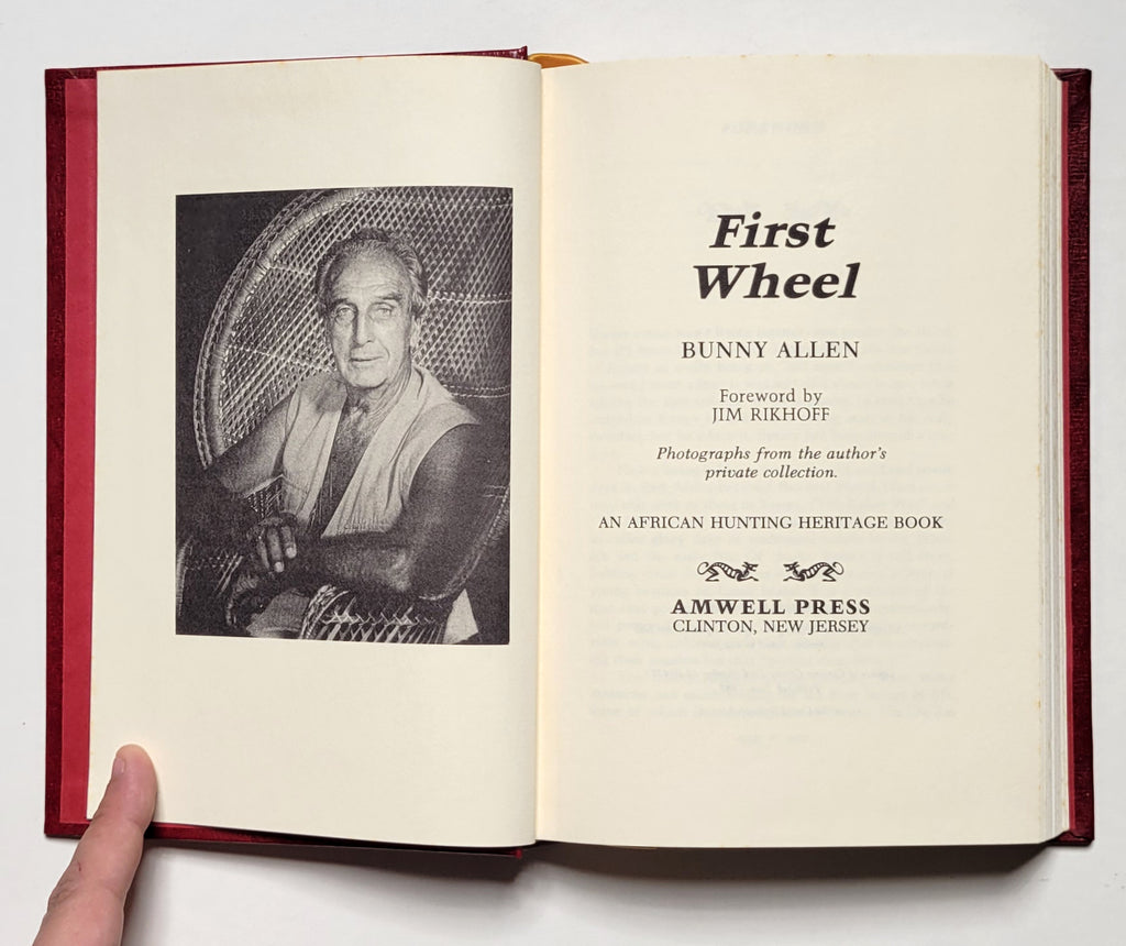 Bunny Allen, First Wheel. Clinton, NJ: Amwell Press, 1983. Hardbound in bonded leather with board slipcase. X 294 pages. Illustrated, ribbon marker. Signed copy #211 of an edition of 1000. Book good; slipcase very good. $35.