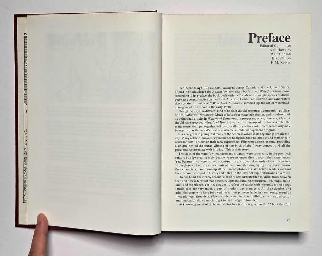 This is a detailed description of the history of wildfowl conservation in the USA, with some reference to Canada and Mexico. The period covered is from about the turn of the twentieth century to 1990's. Each chapter consists of a large number of articles, contributed by 103 different contributers. Chapters include; crisis along the flyways; remembering how it was; remembering the pioneers; foursomes of the flyways; exploring the hinterlands; assessing pothole nesting success; tools of the trade; national and international partnerships; flyway councils; habitat case histories; persistent problems and issues.
