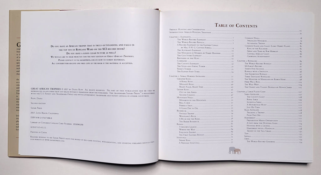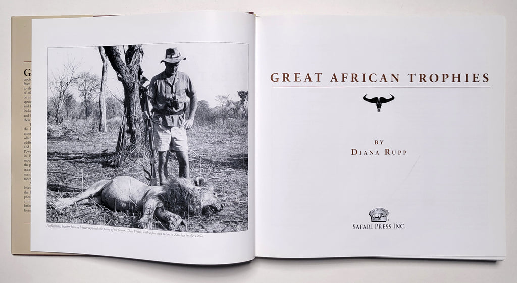 Diana Rupp, Great African Trophies. Long Beach, CA: Safari Press, 2017. Hardbound (large format) in dust jacket. xv, 254 pages. Lavishly illustrated. Book very fine; dust jacket good (spine sunned). $55.