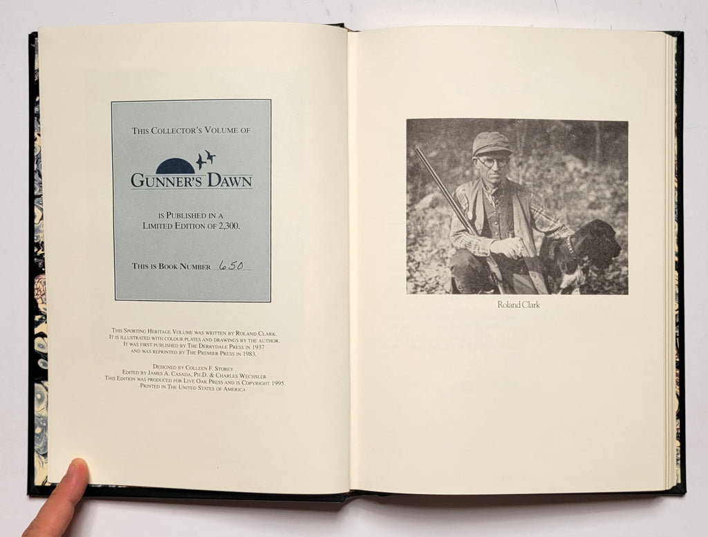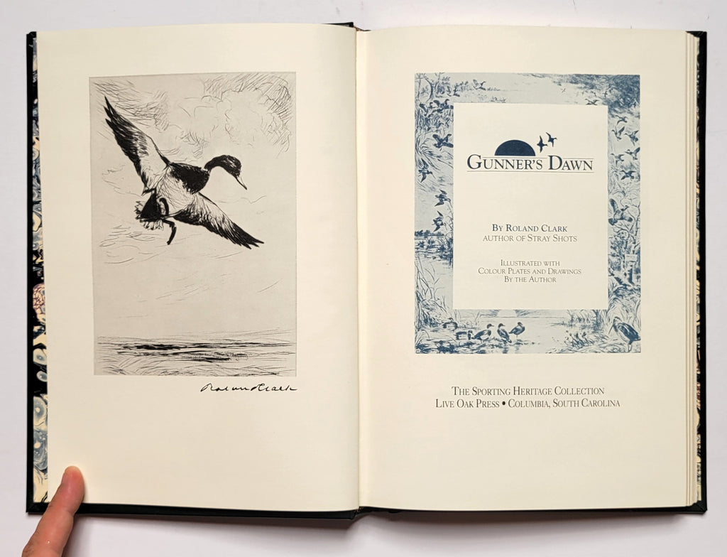 Roland Clark, Gunner’s Dawn. Leatherbound. Columbia, SC: Live Oak Press, 1983. [x], 125 pages. Copy #650 of an edition of 2300. Very fine with marbled endpapers, ribbon marker, raised hubs on spine, all edges gilt, and decorative gold on front and spine. $35.