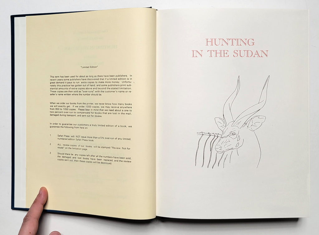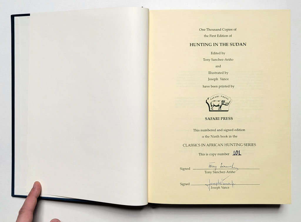 Tony Sanchez-Arino (Editor), Hunting in the Sudan (Volume IX in the Classics in African Hunting Series). Long Beach, CA: Safari Press, 1993. Hardbound in slipcase. Xxii, 517 pages. Lavishly illustrated. Large format. Extensive selection from writings on the region with biographies of the hunters. This volume, like all in the series, is a work of great importance. Signed copy #101 of an edition of 1000. Book and slipcase very fine.  $350.