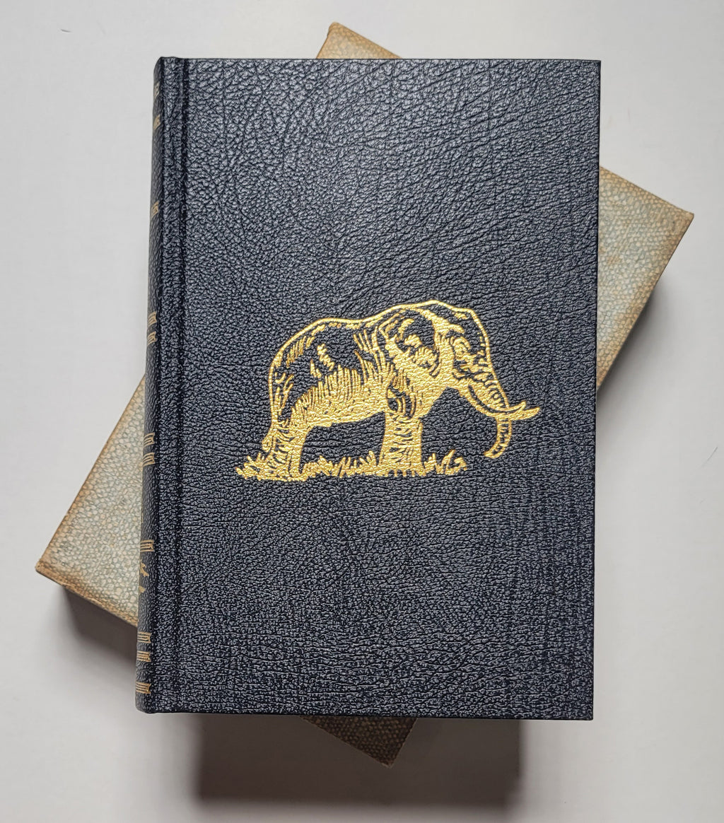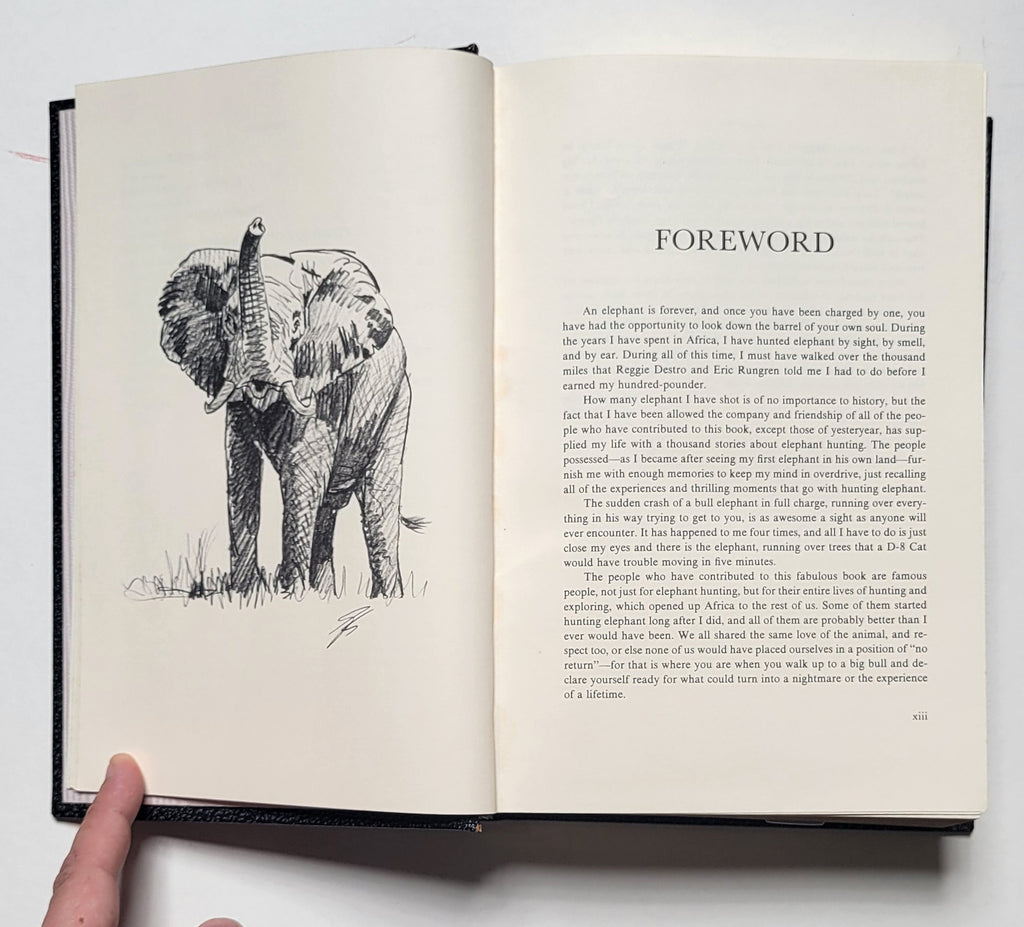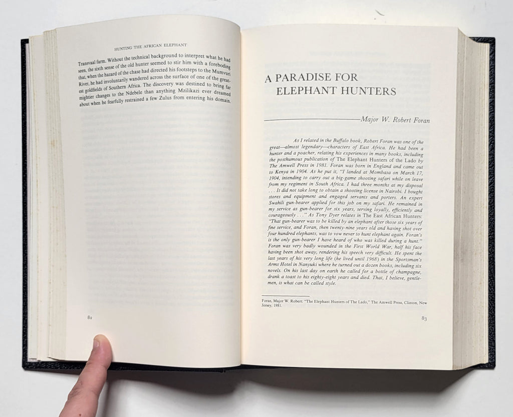 Jim Rikhoff (Editor), Hunting the African Elephant. Clinton, NJ: Amwell Press, 1985. Hardbound in bonded leather with linen over boards slipcase. Xxiv, 688 pages. Illustrated. All edges gilt, ribbon marker. Signed copy #211 of an edition of 1000. Book very fine; slipcase about good (solid but shows staining along edges and some foxing). $300.