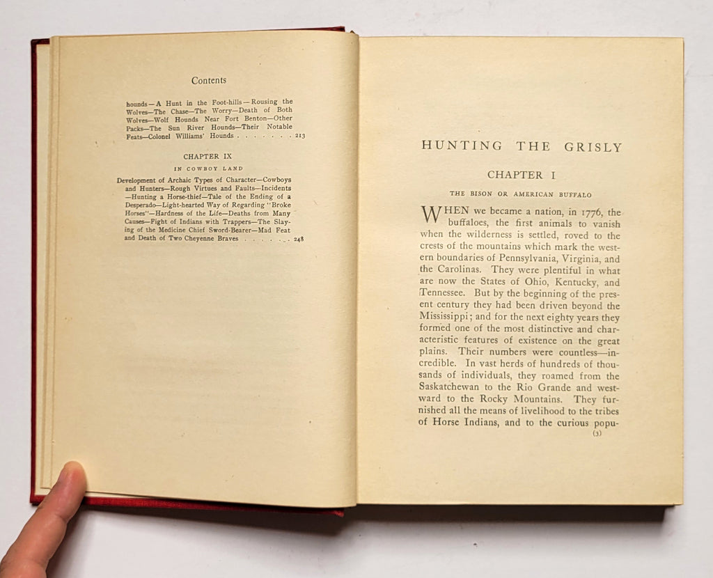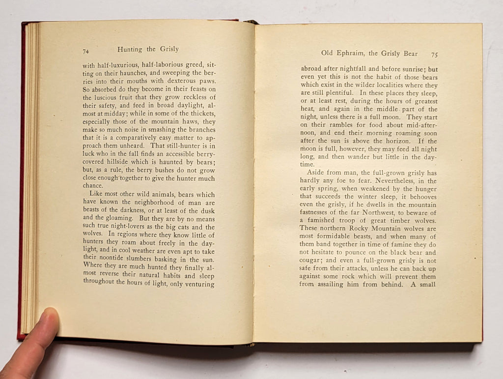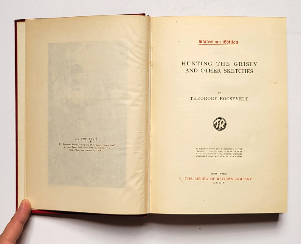 Theodore Roosevelt, Hunting the Grisly and Other Sketches.. Hardbound (Statesman Edition). NY: The Review of Reviews Co., 1904. [iv], 296 pages. Fair. Top and bottom of spine worn, somewhat grubby. Binding tight. $30.