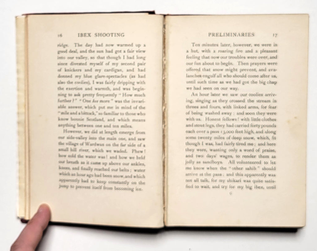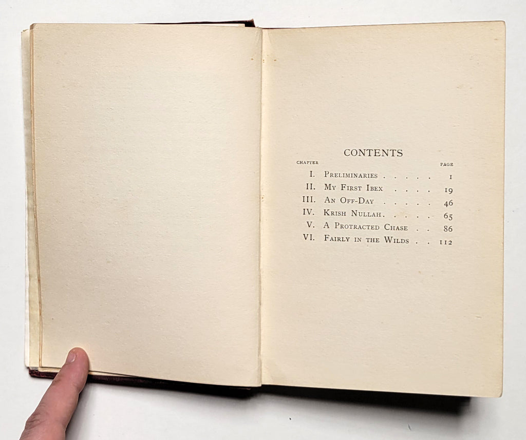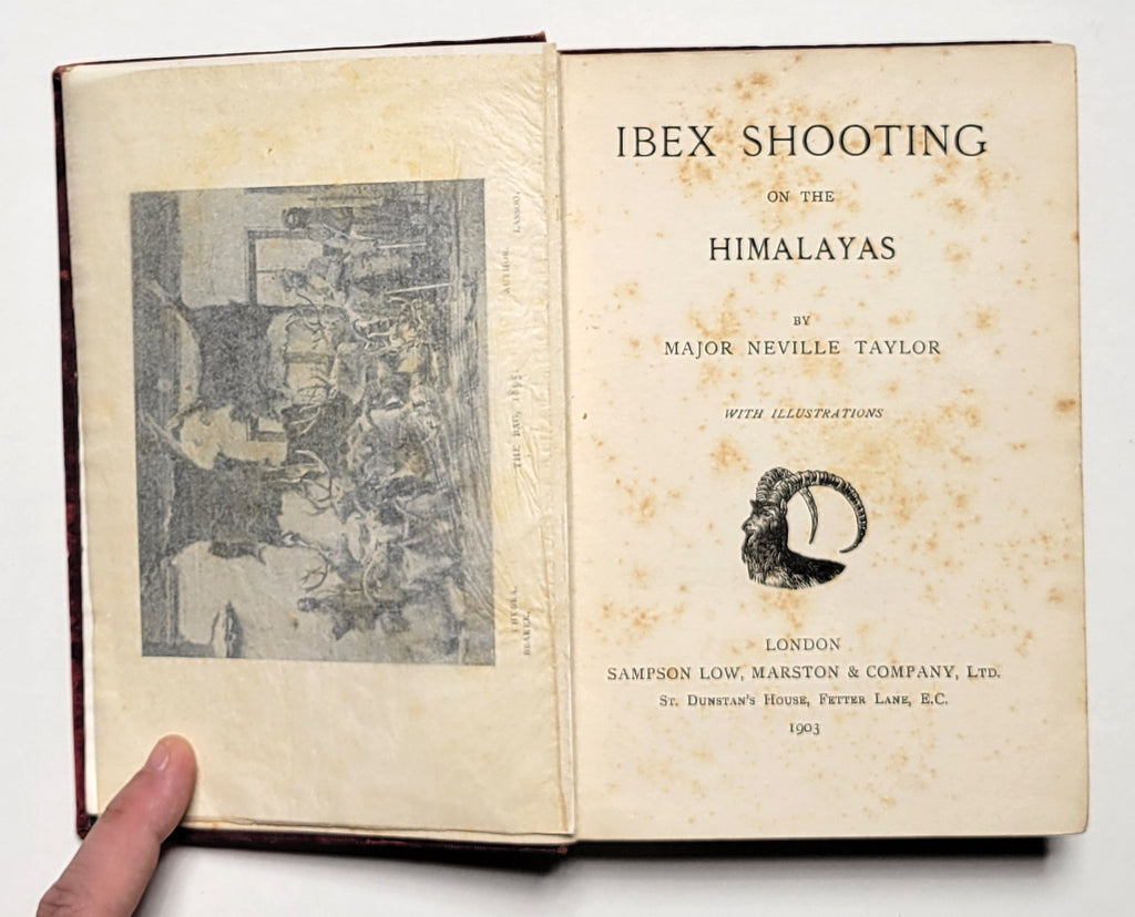 Major Neville Taylor, Ibex Shooting on the Himalayas. London: Sampson Low, Marston & Co., 1903. Hardbound. xvi , 146 pages. Fair only (foxing, frontispiece loose, worn and faded edges). 1st edition. $40.
