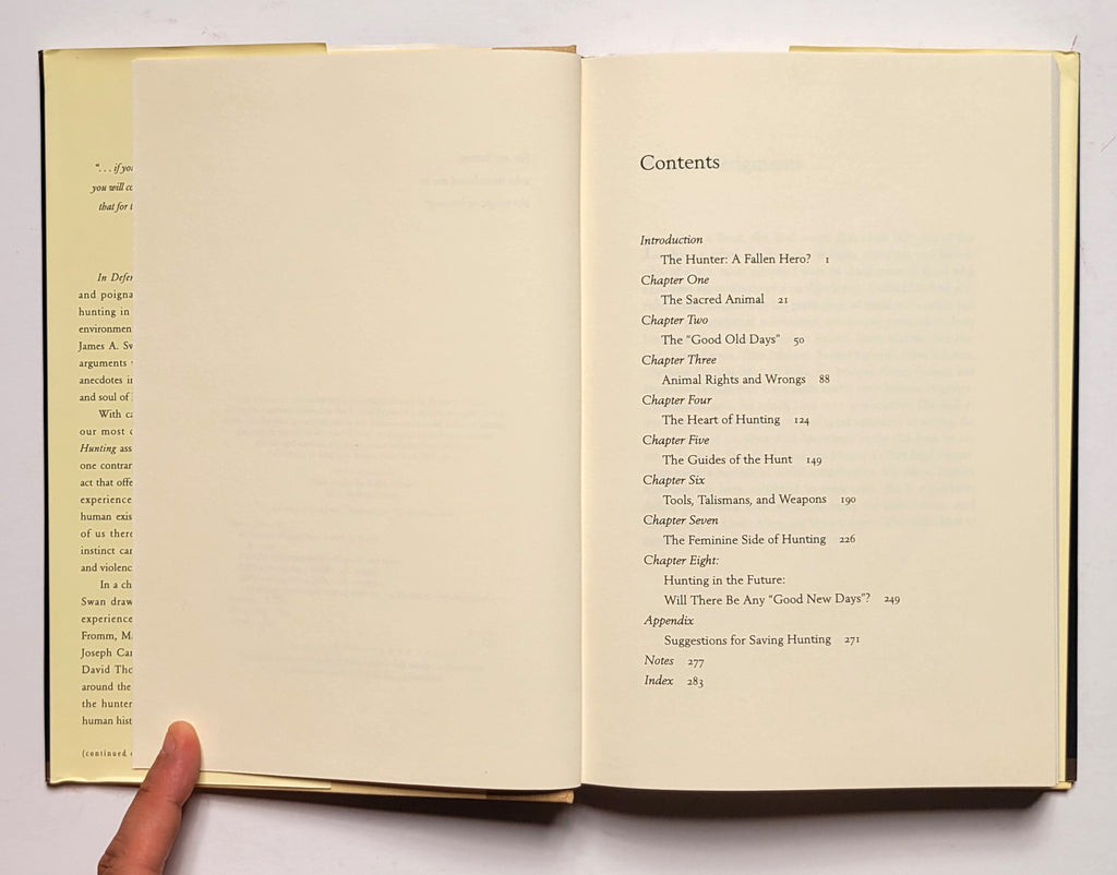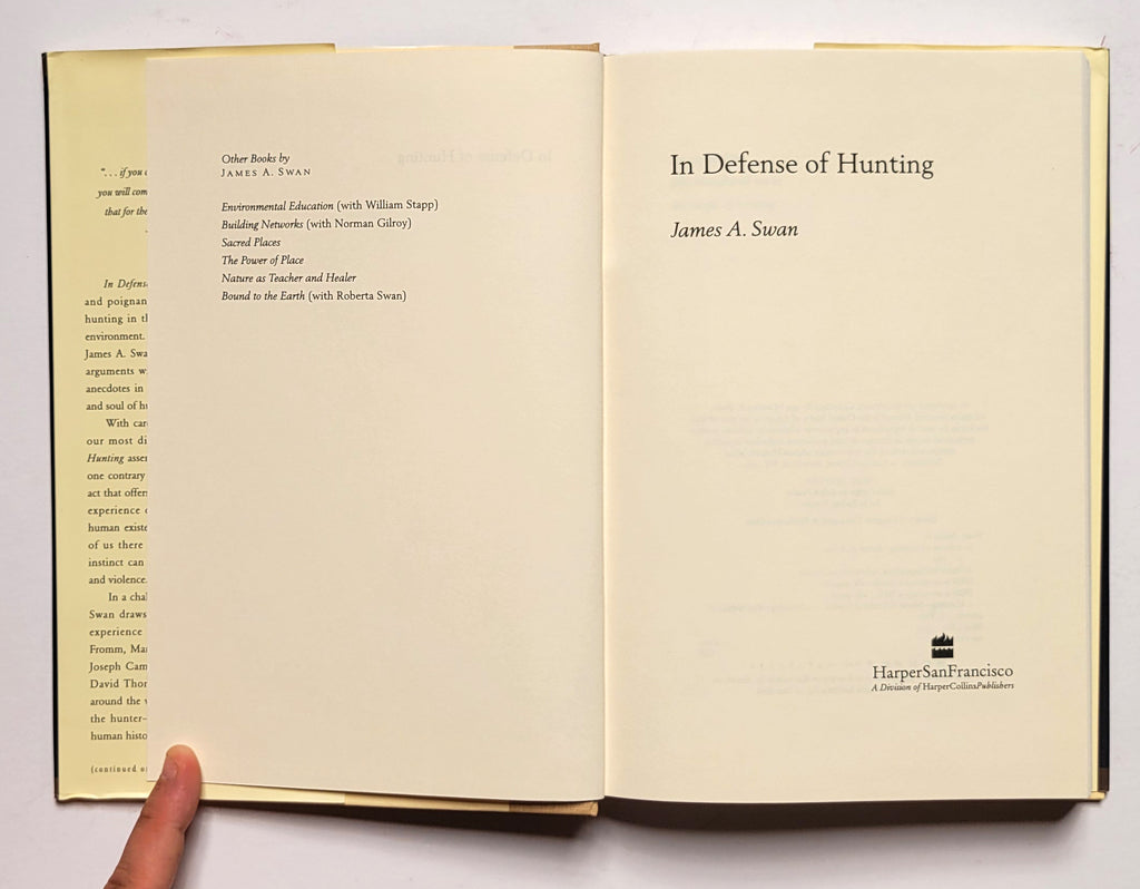 James A. Swan, In Defense of Hunting. San Francisco, CA: HarperSanFraincisco, 1995. 1st edition. Hardbound in dust jacket.x, 290 pages. Index. Book very fine; dust jacket fair. $8.