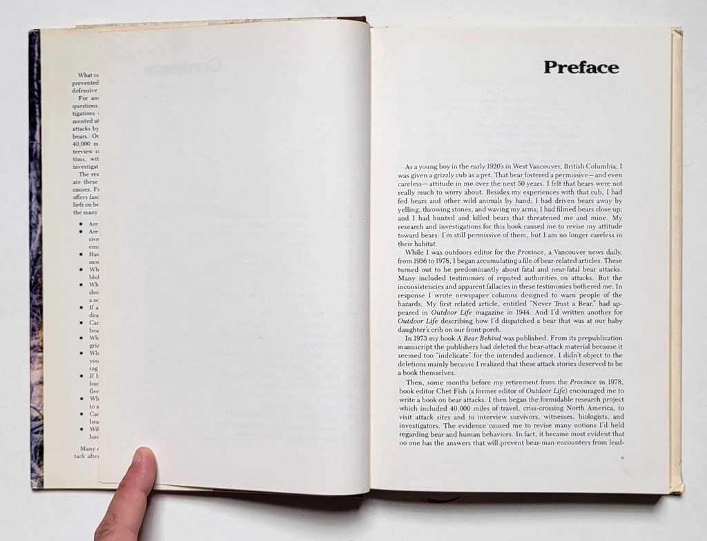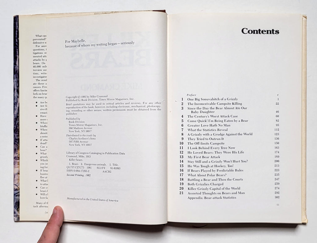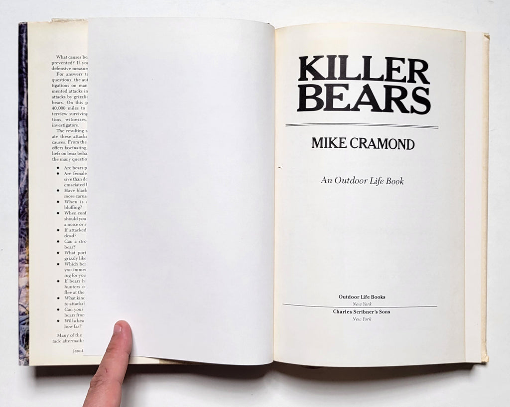 Mike Cramond, Killer Bears. NY: Charles Scribner’s Sons, 1982. 2nd printing. Hardbound in dust jacket. vi, 299 pages with an appendix of documented bear attacks. Book and dust jacket good. $8.