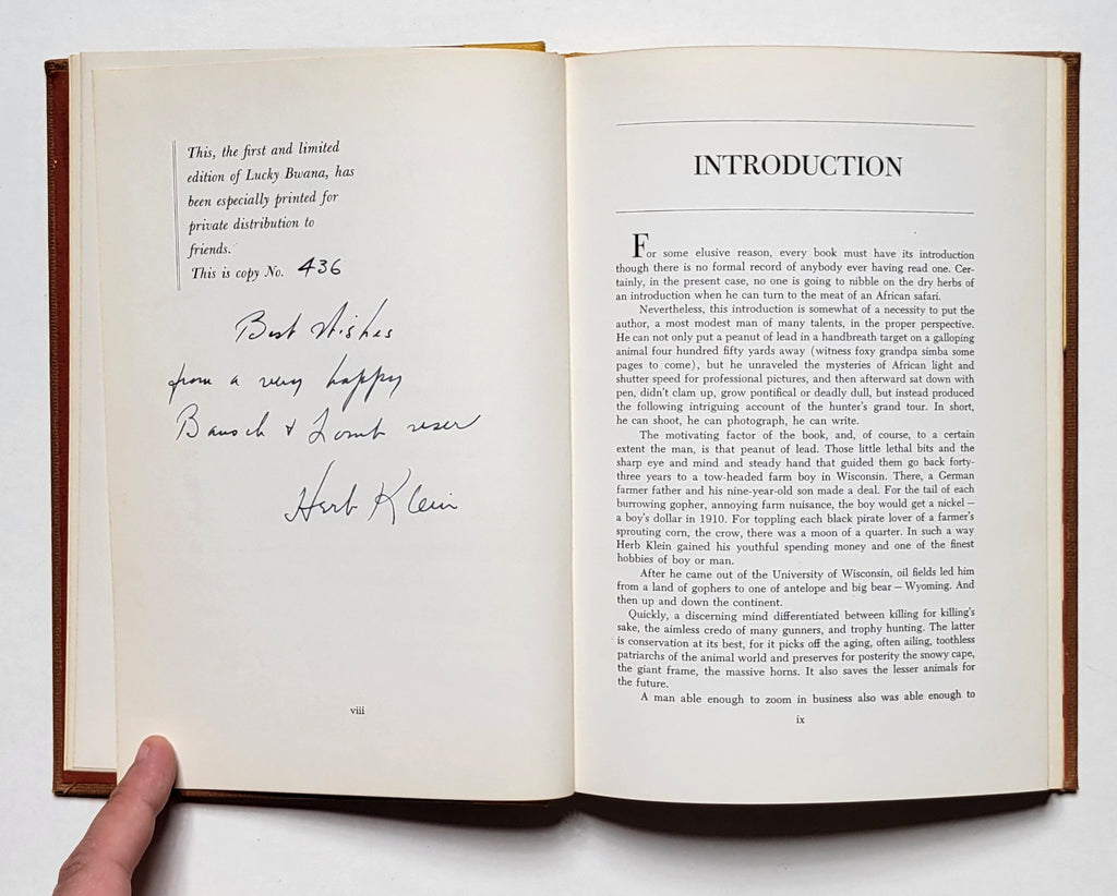Herb Klein, Lucky Bwana: The Adventures of a Big Game Hunter in British East Africa. Hardbound (no dust jacket). Dallas, TX: Privately printed, 1953. X 128 pages. Illustrated. Fine. $17.