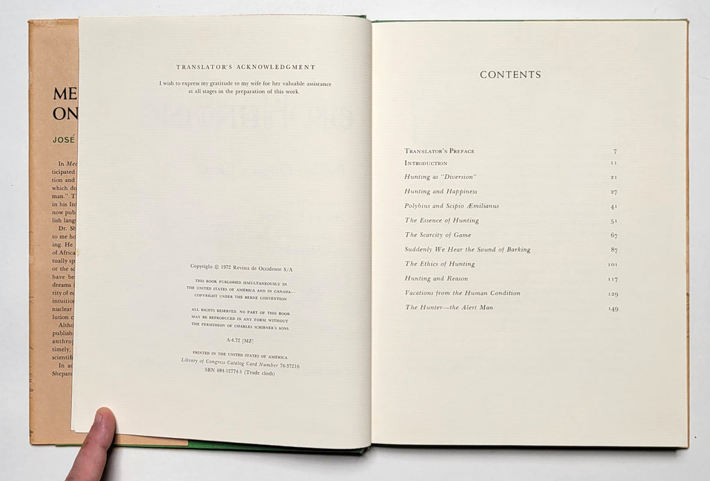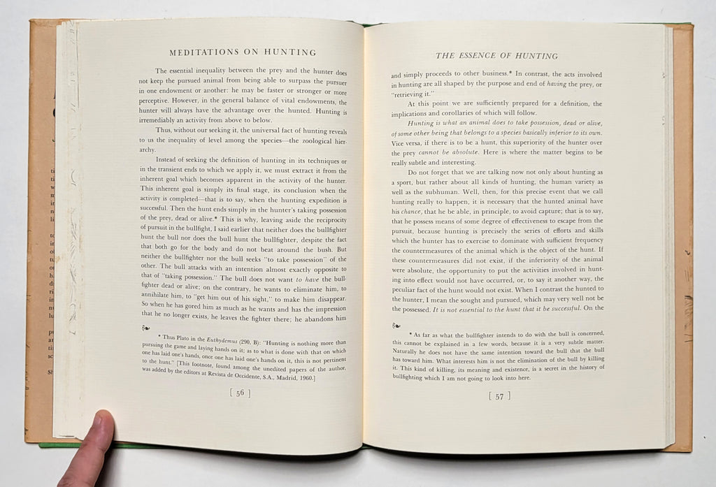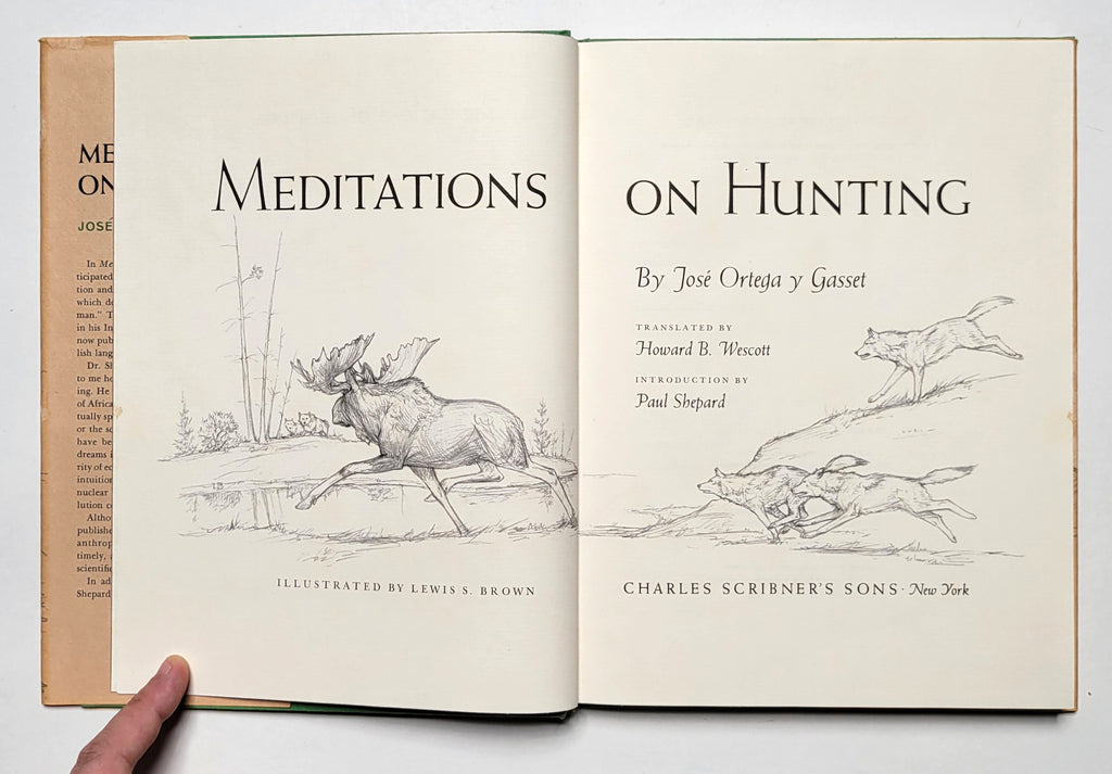 Jose Ortega y Gasset, Meditations on Hunting. NY; Charles Scribner’s Sons, 1972. Hardbound in price-clipped dust jacket. 152 pages. Illustrated. 1st American edition. Book very good; dust jacket fair. $70.