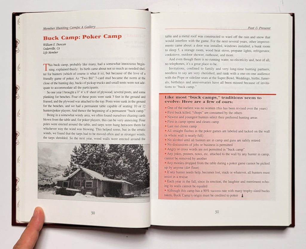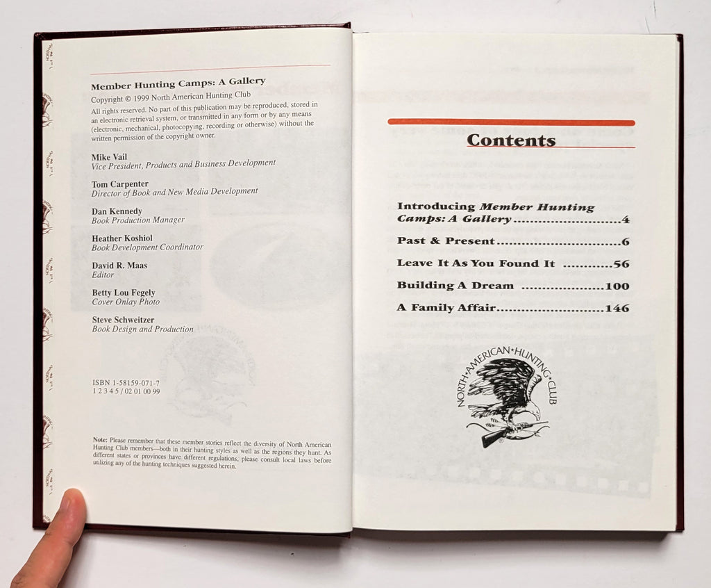 David Maas (Editor), Member Hunting Camps: A Gallery. Hardbound (issued without a dust jacket). Minnetonka, MN: North American Outdoor Group, 1999. 221 pages. Coverage of scores of hunting camps and clubs all across the country. Very fine. $15.
