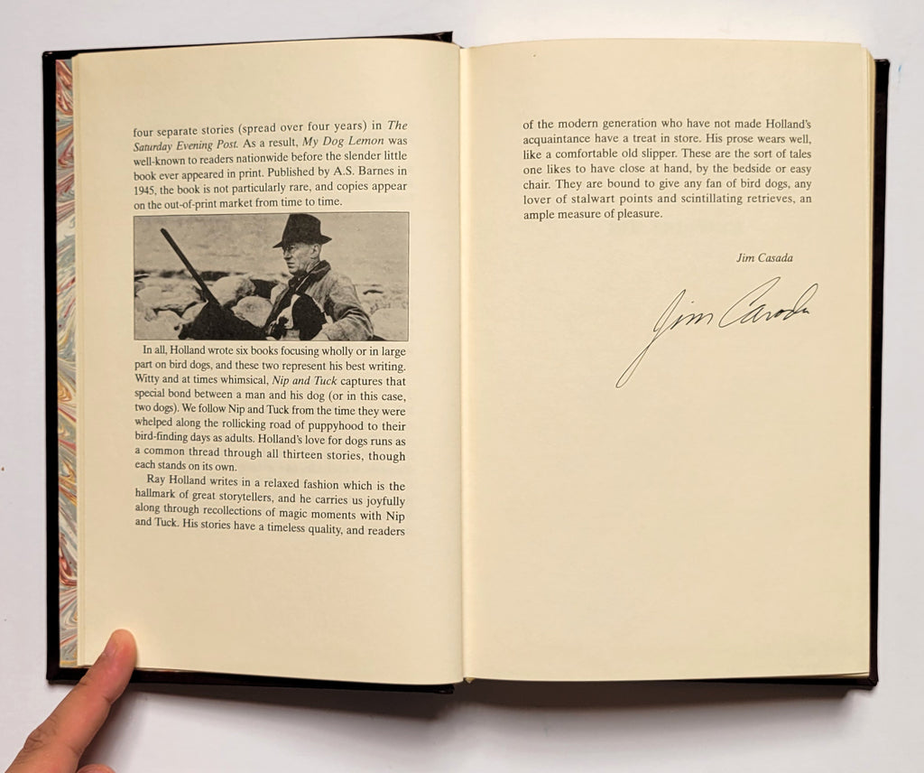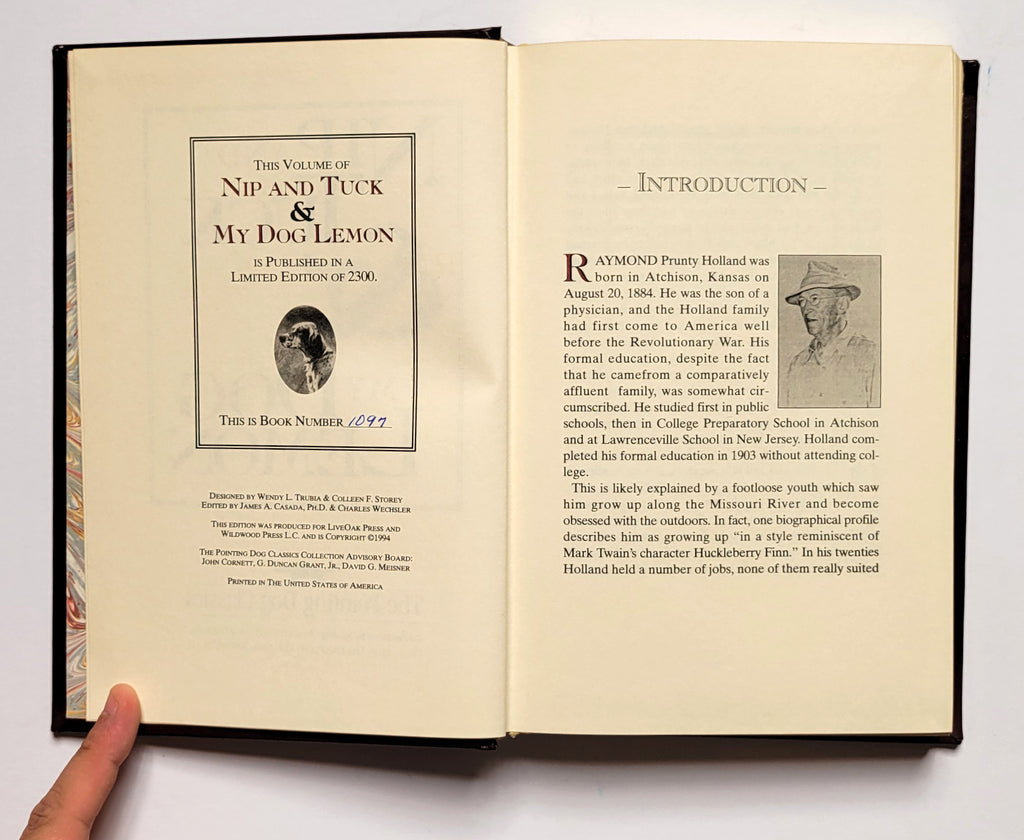 Raymond P. Holland, Nip and Tuck & My Dog Lemon (two books in one—with an Introduction by Jim Casada). Columbia, SC: LiveOak Press, 1994. Hardbound in full leather. [xii], 274 pages. Illustrated, all edges gilt, ribbon marker, marbled endpapers, raised hubs on spine. Copy 1097 of an edition of 2300. Fine. $50.