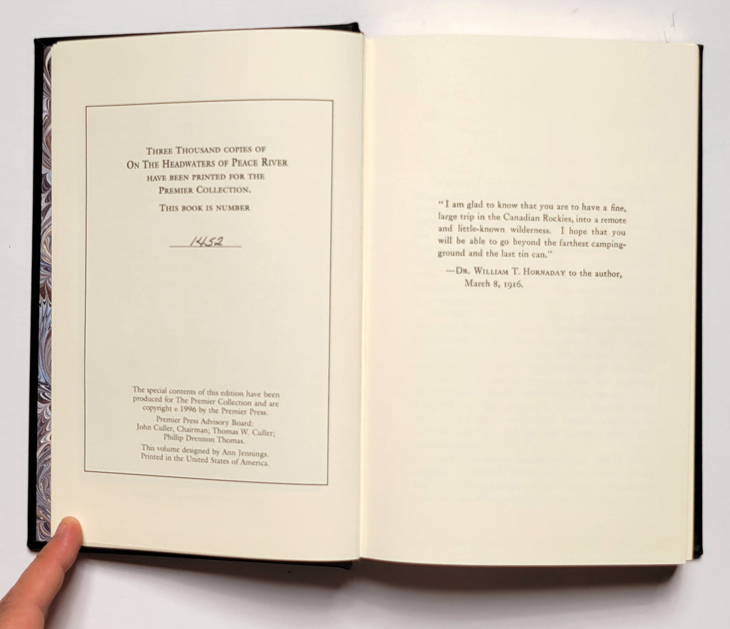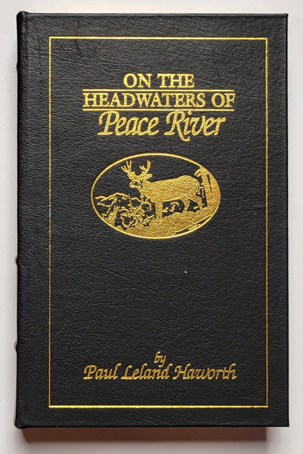 Paul Leland Haworth, On the Headwaters of Peace River. Hardbound in leather. Camden, SC: The Premier Press, 1996. Xviii, 295 pages. Illustrated. Copy #1452 of an edition of 3000. Very fine with marbled endpapers, ribbon marker, raised hubs on spine, all edges gilt, and decorative gold gilt on front and spine. $35.