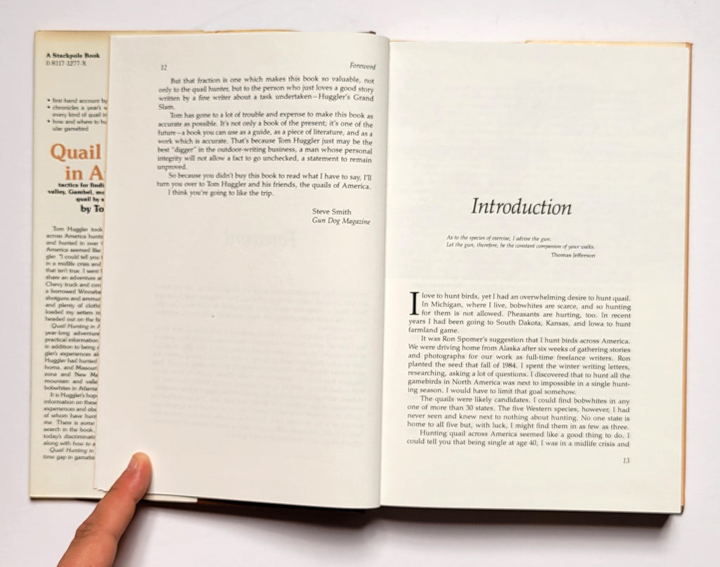 Tom Huggler, Quail Hunting in America. Harrisburg PA: Stackpole, 1987. Hardbound in dust jacket. 287 pages. Illustrated, index. Book and dust jacket fine. $12.