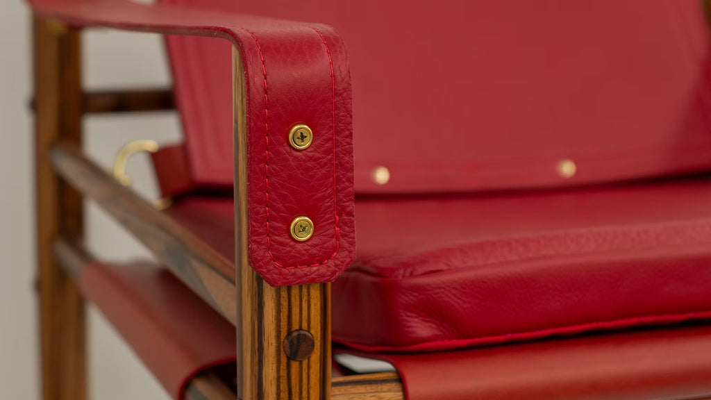 The Red Leather Safari chair is the perfect pop of color! Featuring polished brass hardware, red padded cushion and a zebrawood frame.