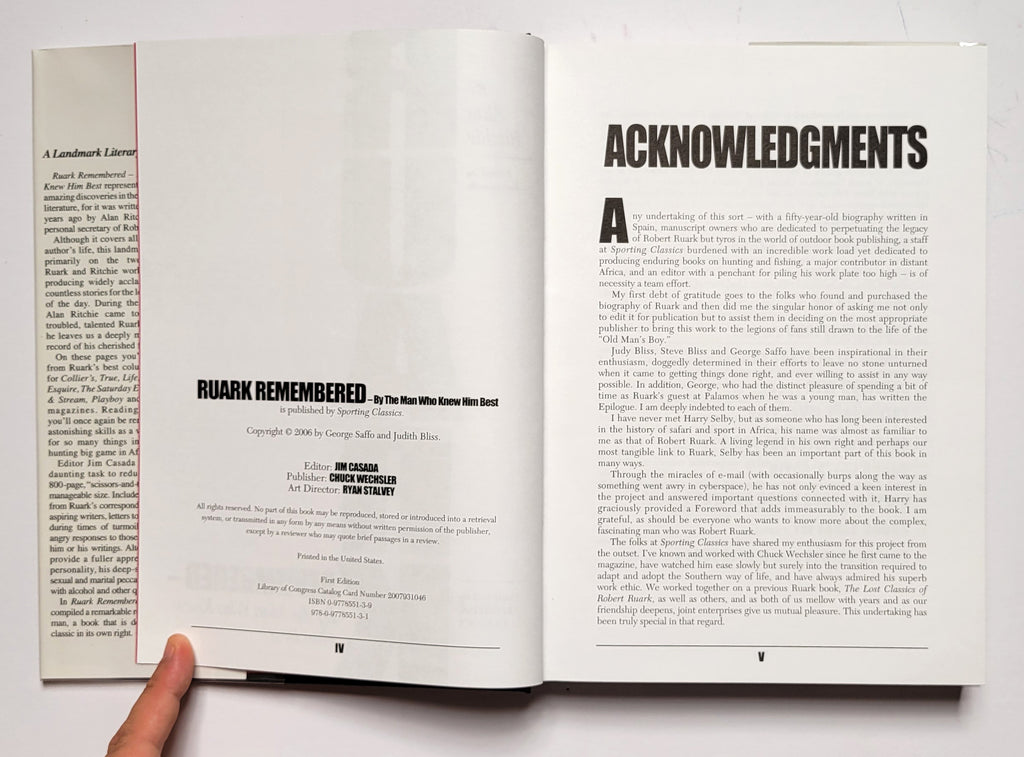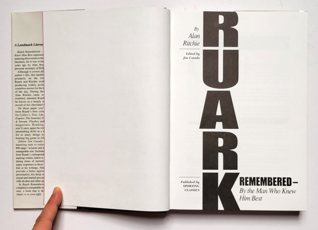 Alan Ritchie, Ruark Remembered: By the Man Who Knew Him Best (edited and with an Introduction by Jim Casada as well as a Foreword by Harry Selby). Hardbound in glassine-protected dust jacket. Columbia, SC: Sporting Classics, 2006. X, 274 pages. Illustrated. Signed by Casada. 1st edition. Book and dust jacket very fine. $45.