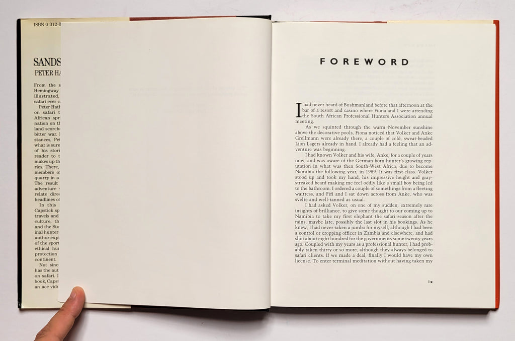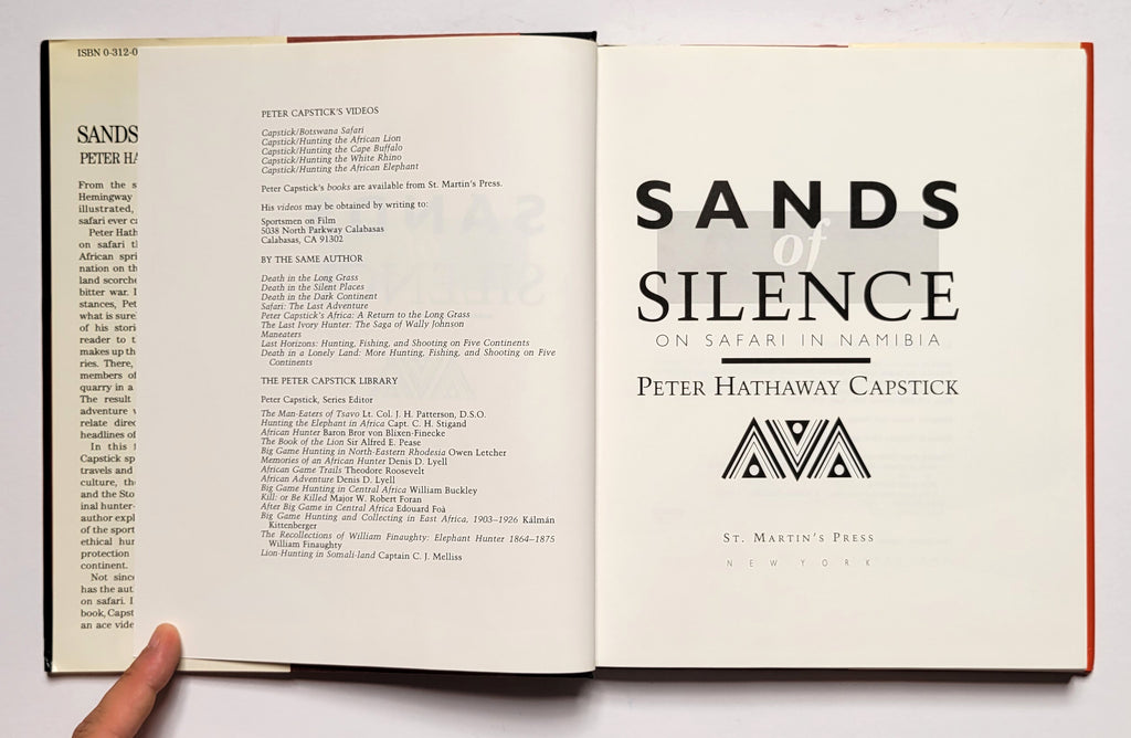 Peter Capstick, Sands of Silence: On Safari in Namibia. NY: St. Martin’s Press, 1991. 1st edition. xx, 214 pages. Illustrated. Book and dust jacket fine. $30.