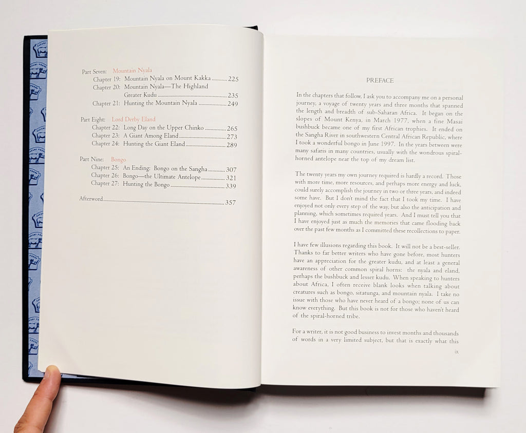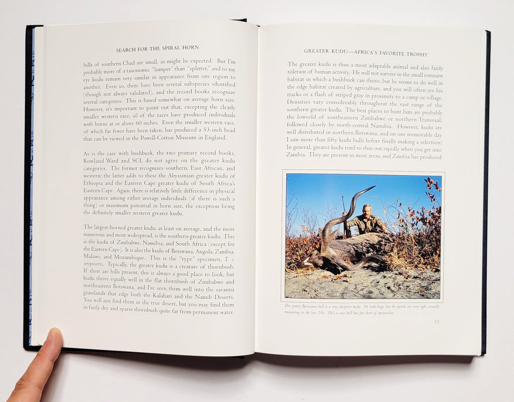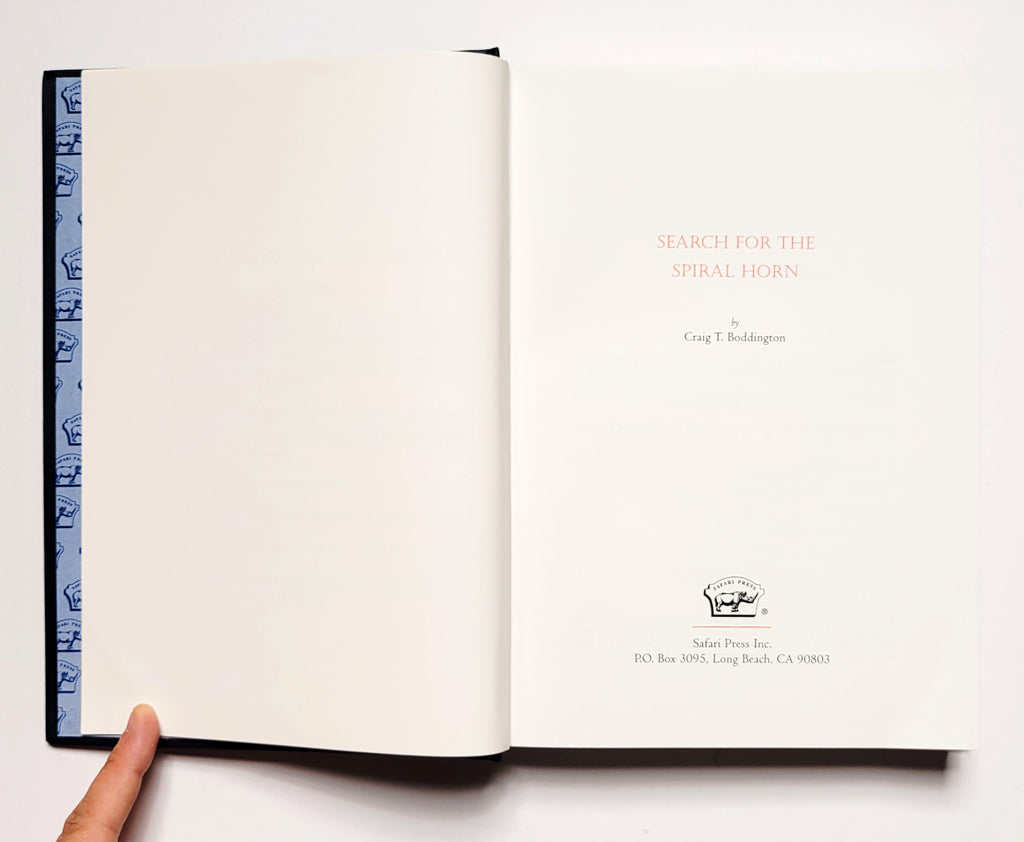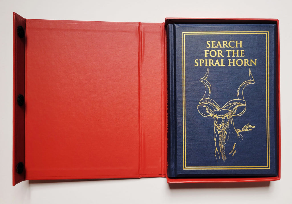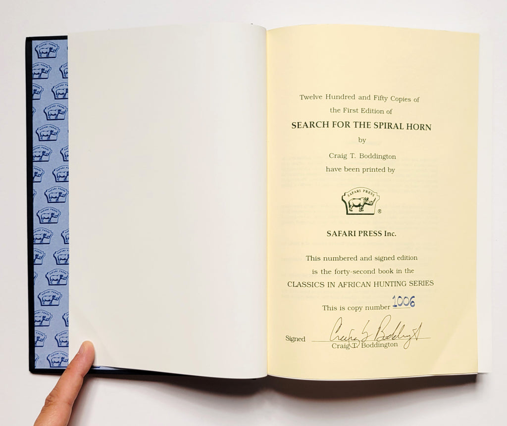 Craig Boddington, Search for the Spiral Horn. Long Beach, CA: Safari Press, 2002. Hardbound (large format) in a sturdy clamshell-like case with Velcro closures. Xiv, 357 pages. Illustrated. Signed copy #1006 of an edition of 1250 copies. Book and case very fine. Rare and a beautifully done book. $350.