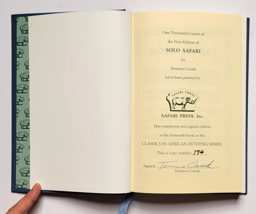 Terrance Cacek, Solo Safari. Long Beach, CA: Safari Press, 1994. Hardbound in covered boards slipcase. [viii], 300 pages. Illustrated, ribbon marker, index. Signed copy #174 of an edition of 1000. $50.