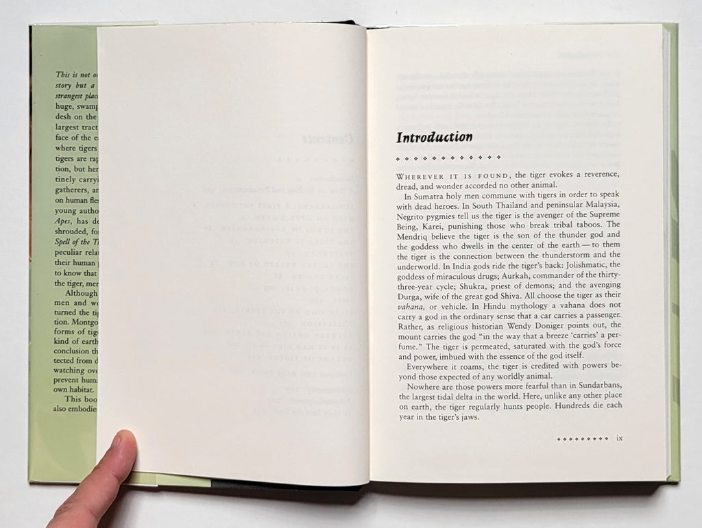 Sy Montgomery, Spell of the Tiger: The Man-Eaters of Sundarbans. Boston: Houghton Mifflin, 1995. Hardbound in glassine-protected dust jacket. xx, 232 pages. Illustrated, bibliography. 1st edition. Book and dust jacket about fine. $8.