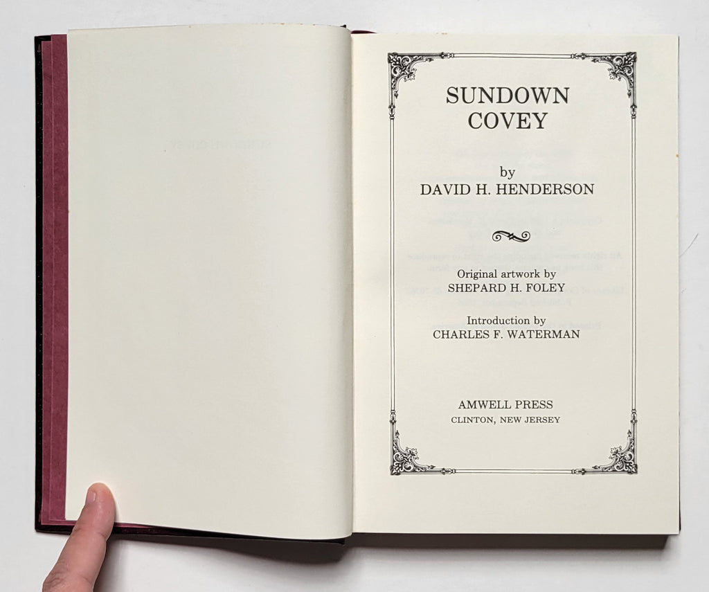 David Henderson, Sundown Covey. Clinton, NJ: Amwell Press, 1986. Hardbound in slipcase. Xviii, 214 pages. Signed copy #211 of 1000. Book good plus; slipcase very good. $35.