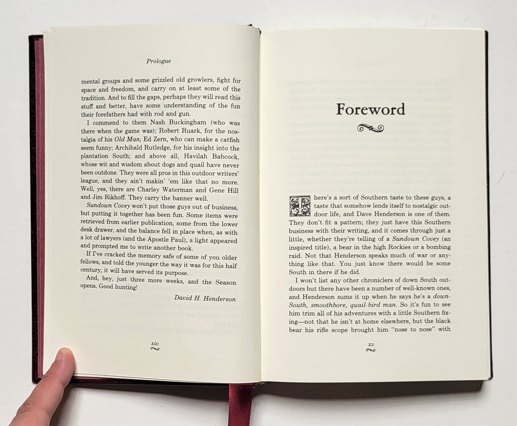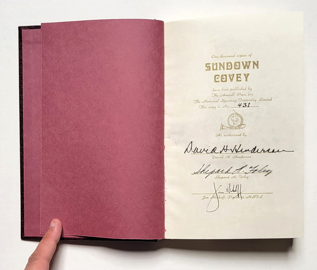 David Henderson, Sundown Covey (with an Introduction by Charles F. Waterman). Clinton, N: Amwell Press, 1986. Xviii, 204 pages. Hardbound in bonded leather with board slipcase. Illustrated (by Shep Foley), ribbon marker. Book and slipcase very fine. $38.