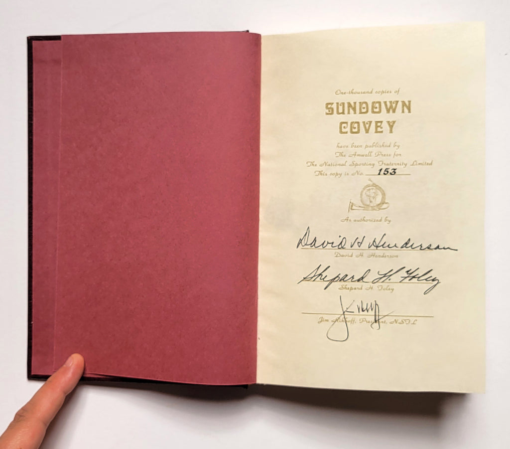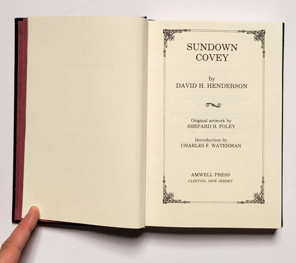 David Henderson, Sundown Covey (with a Introduction by Charles Waterman). Clinton, NJ: Amwell Press, 1986). Hardbound in bonded leather with covered boards slipcase. Xviii, 204 pages. Illustrations by Shep Foley, the author’s daughter; ribbon marker. Signed copy (by the author, artist, and publisher) #153 of an edition of 1000. Book very fine; slipcase good (fading at edges). $45.