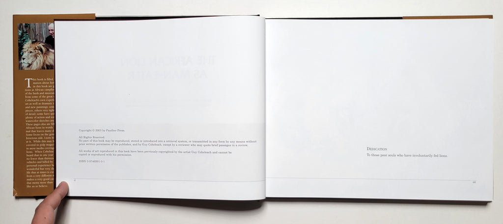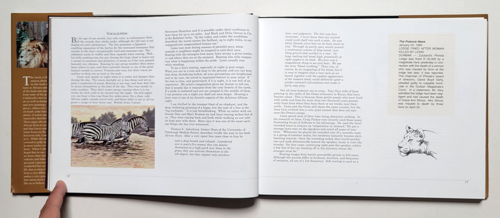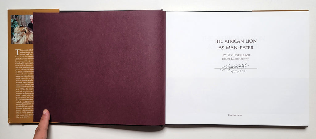 Deluxe limited edition #470/650. Signed by the author. Beautifully illustrated in color throughout, with forward by Jack Nicklaus. Hardcover with dust jacket. DJ in very good condition. Natural life history of African Lion and its not so rare man-eating habits.