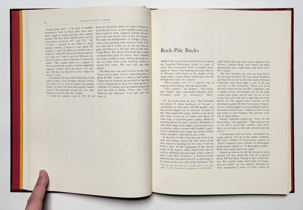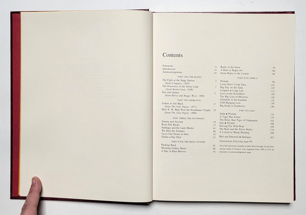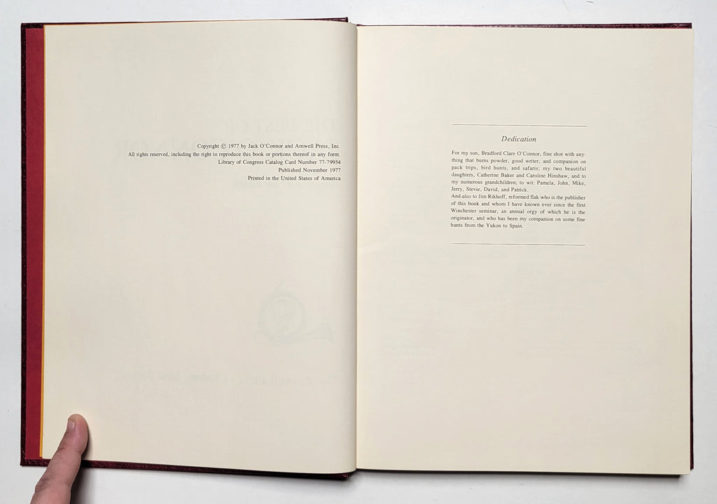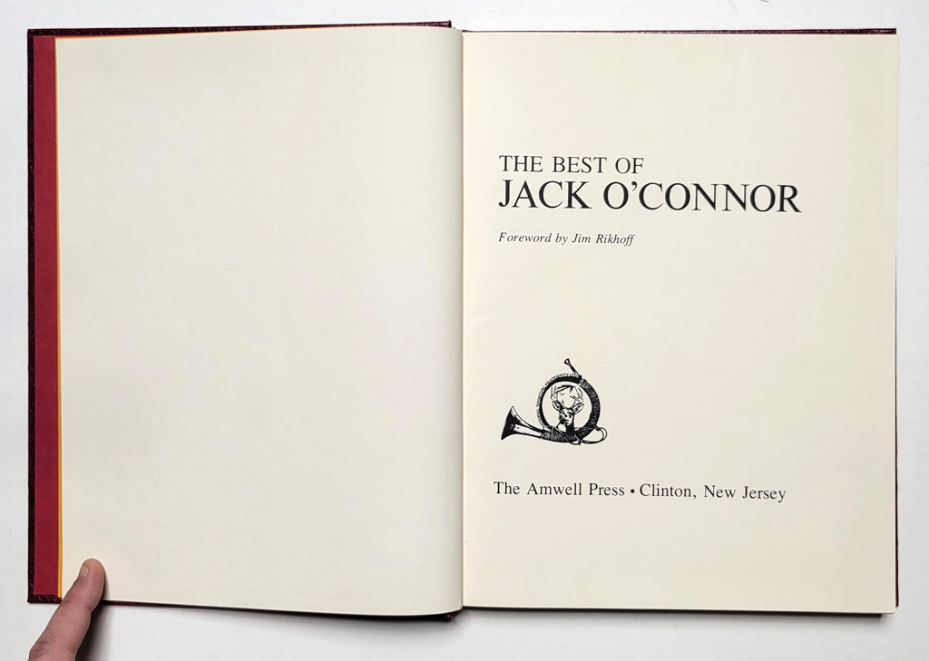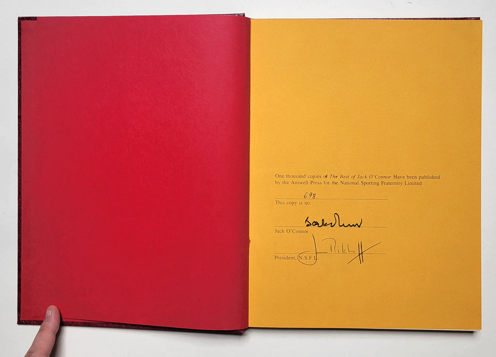 Jack O’Connor, The Best of Jack O’Connor. Clinton, NJ: Amwell Press, 1977. Hardbound in mottled leather (large format) in board slipcase. Illustrated. Signed copy #698 of an edition of 1000. Book in fine; slipcase poor (splitting on top edge). $40.