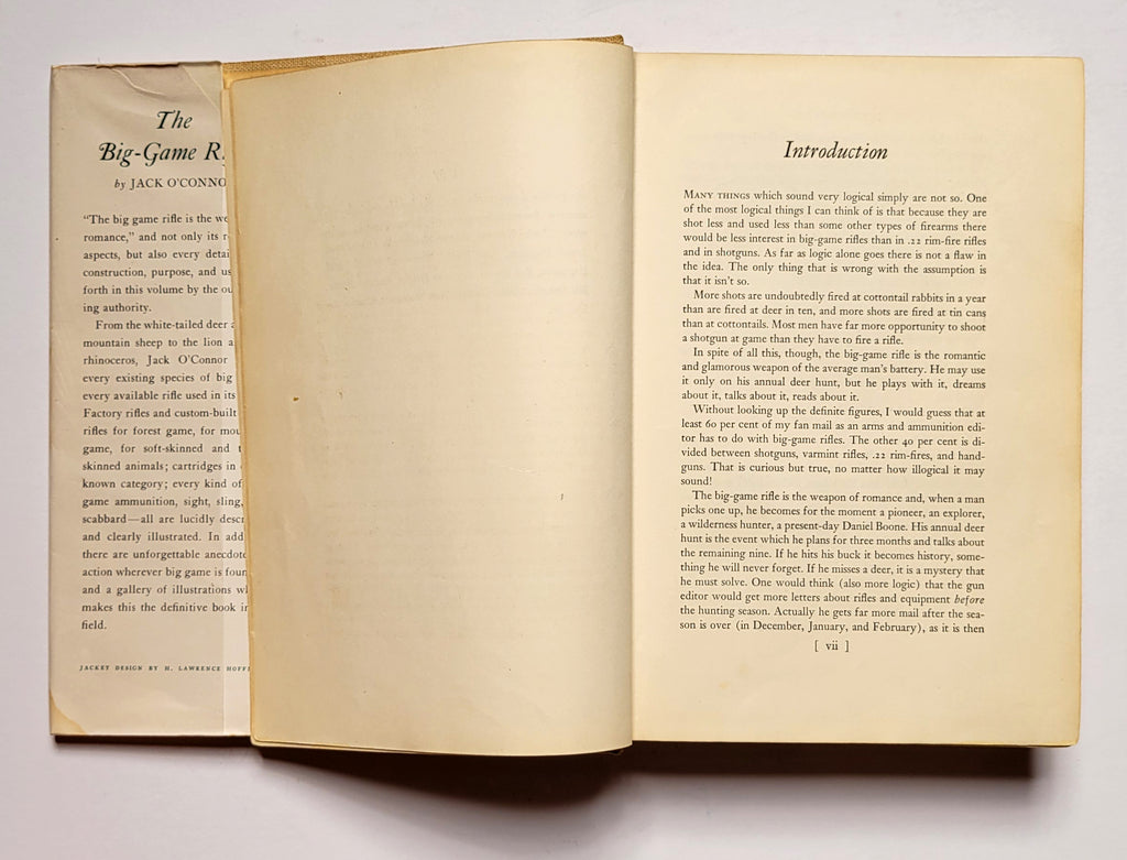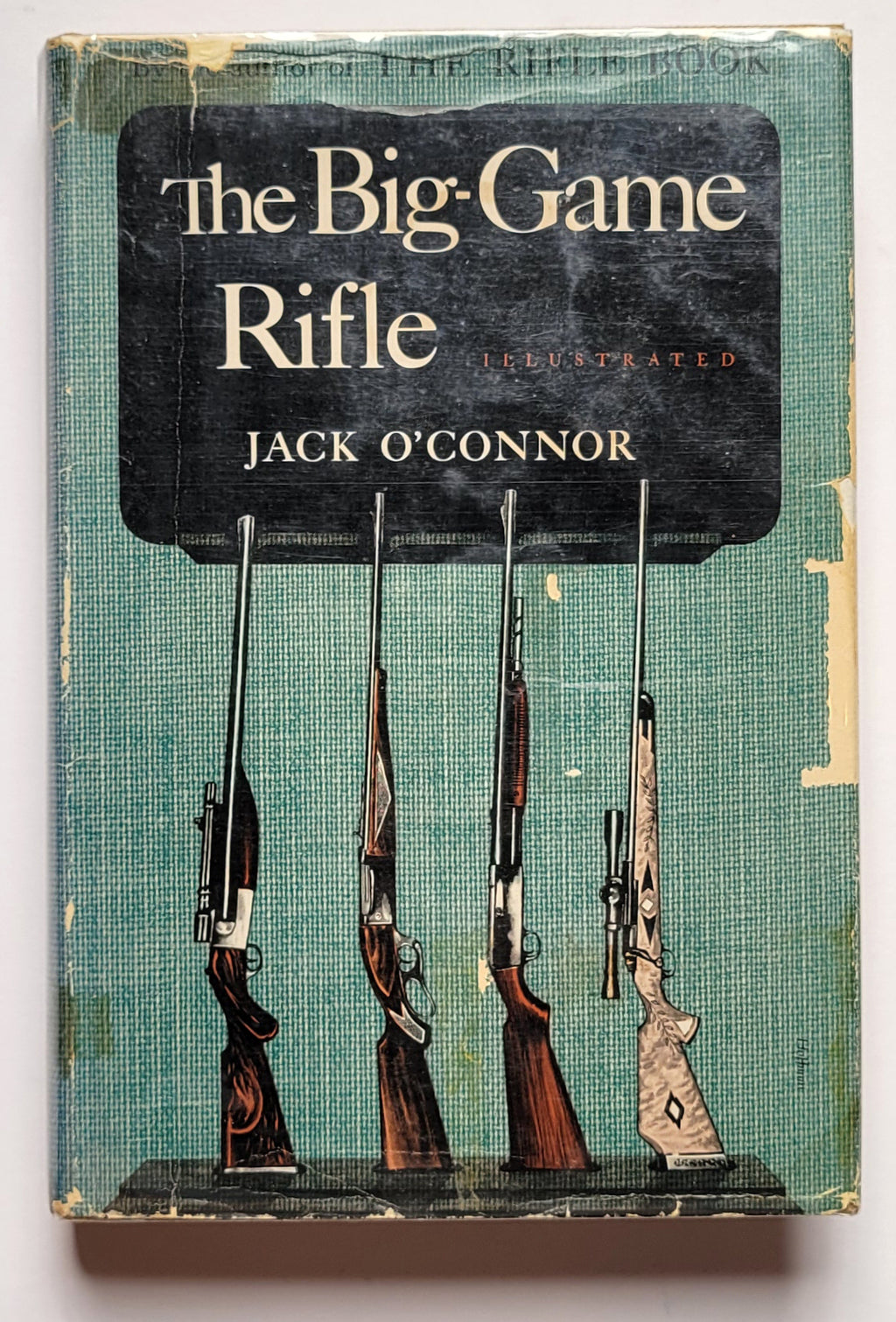 Jack O’Connor, The Big-Game Rifle. Hardbound in price-clipped, glassine protected dust jacket. NY: Alfred A. Knopf, 1952. 1st edition. xvi, 371, xi pages. Illustrated ex lib. copy. Reading copy only. $10.
