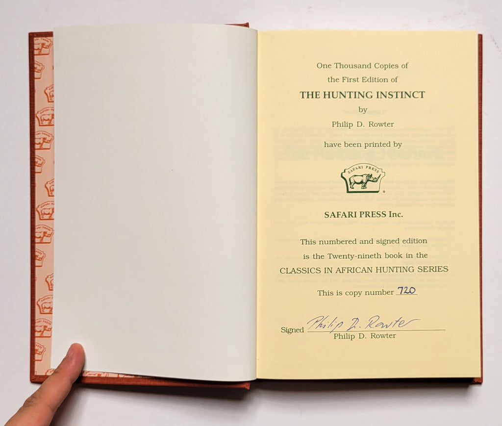 Philip D. Rowter, The Hunting Instinct. San Marino, CA: Safari Press, 1999. Hardbound in covered boards slipcase. xiv, 237 pages. Illustrated. Signed copy #720 of 1000. Book and slipcase very fine. $55.