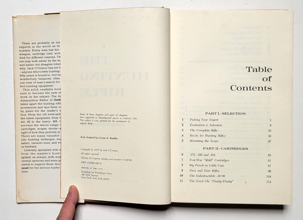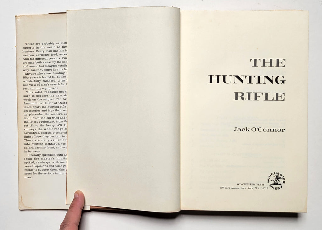 Jack O’Connor, The Hunting Rifle. NY: Winchester Press, 1970. Hardbound in dust jacket. [iv], 314 pages. Illustrated, index. Although tight, reading copy only because of moisture stain. $5.