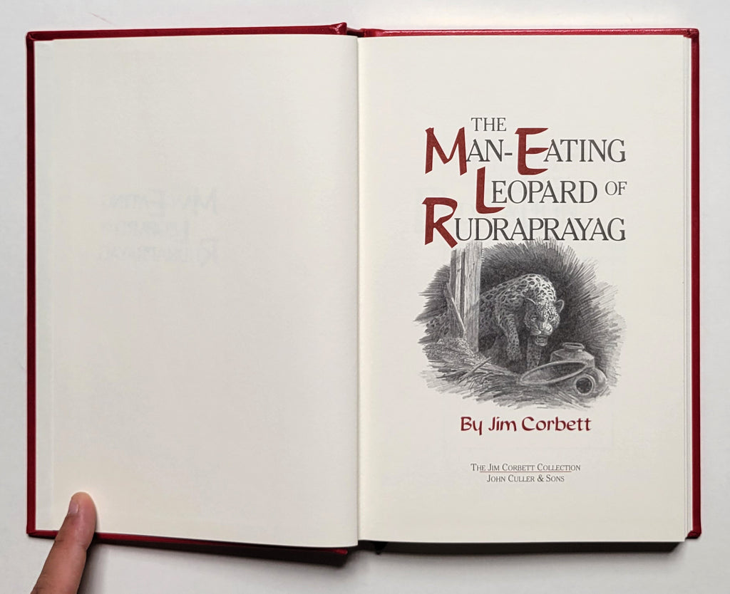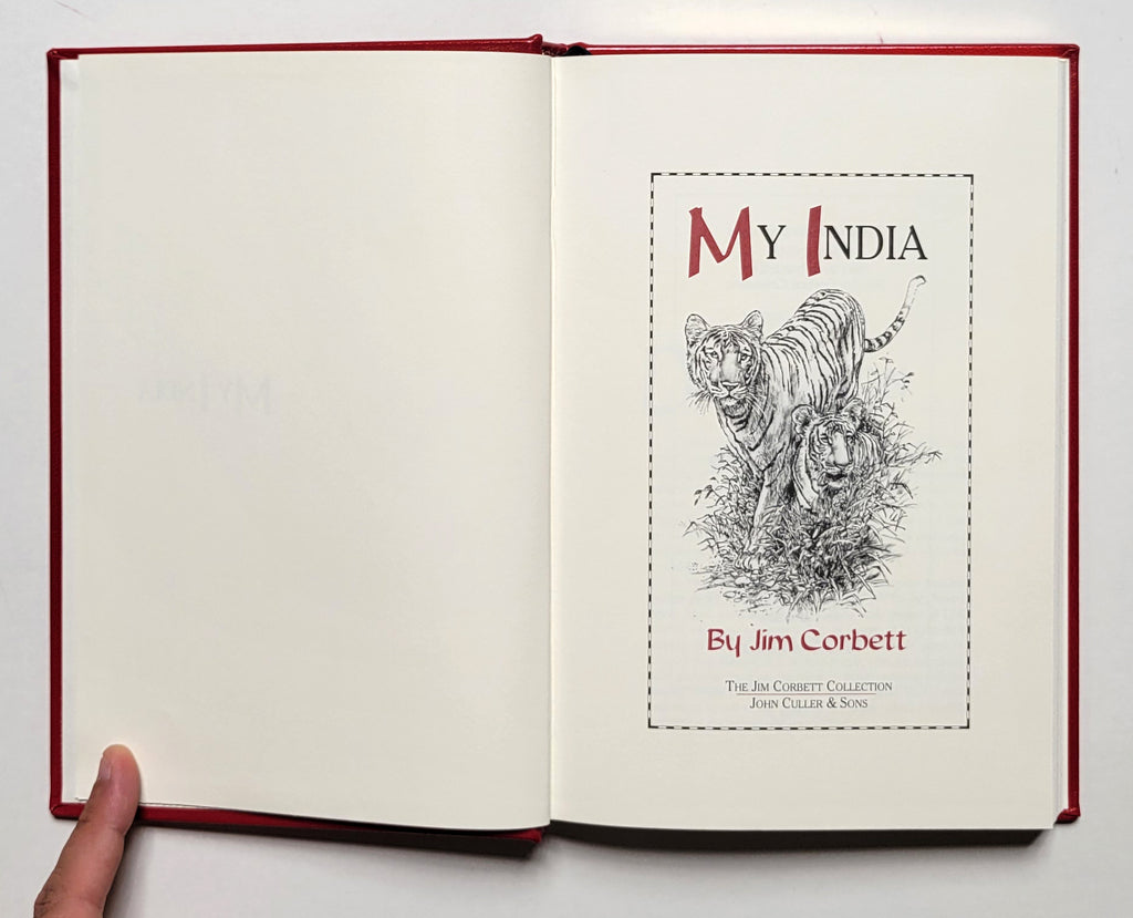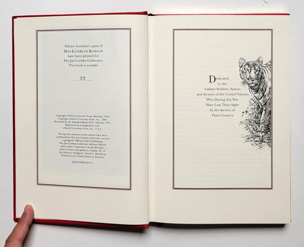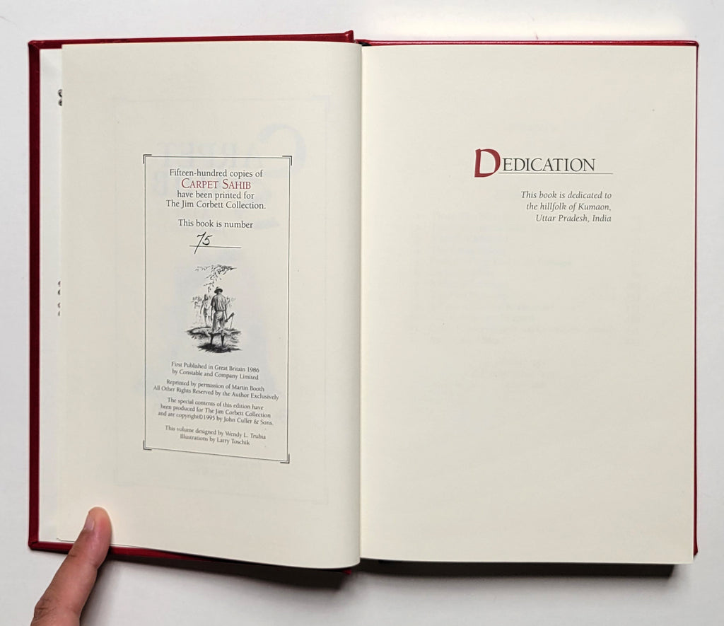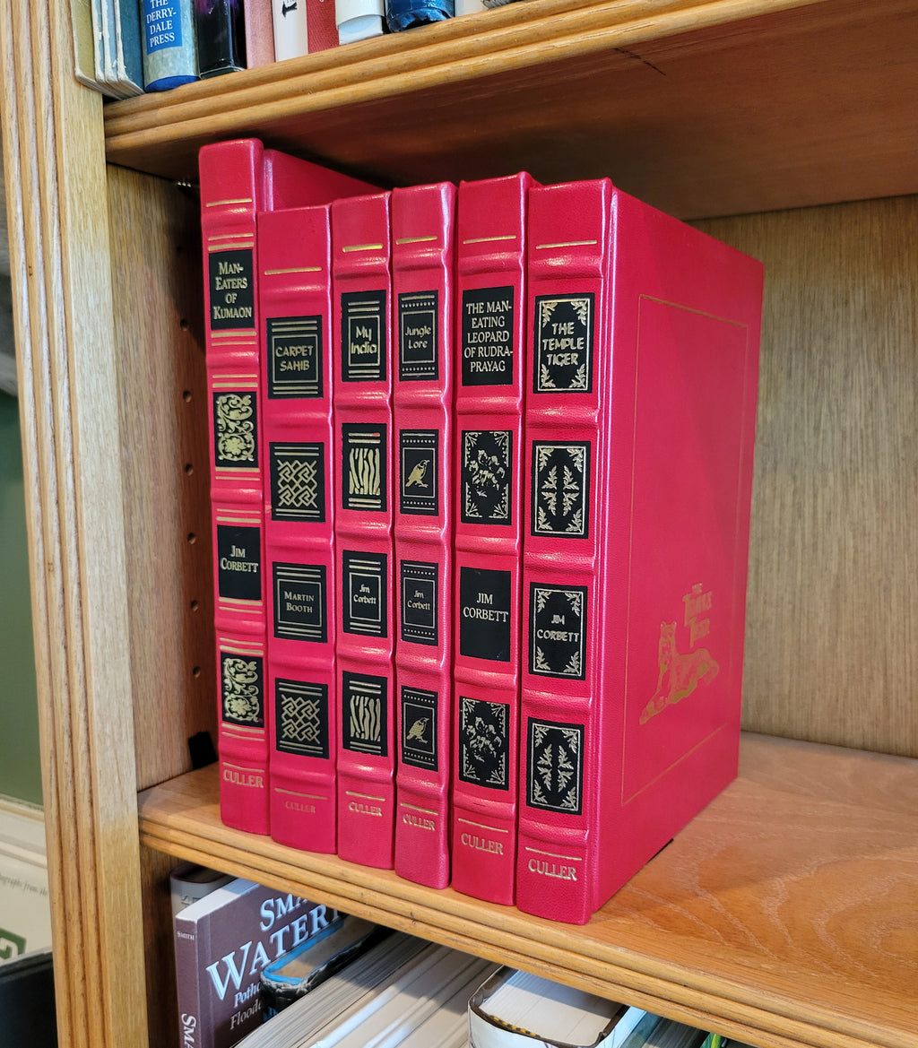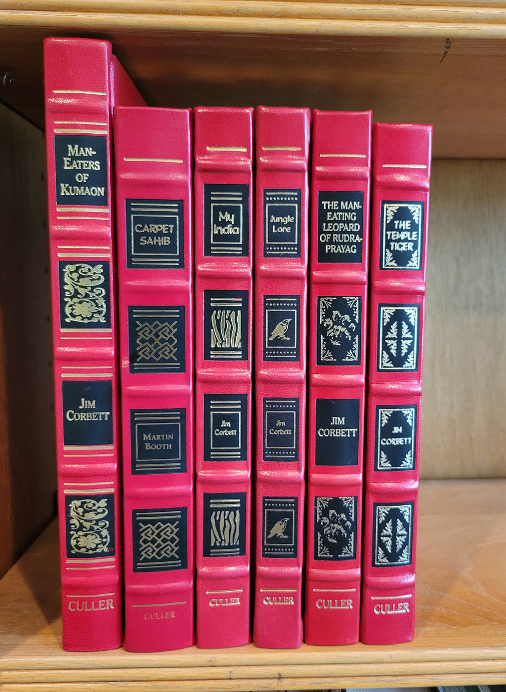 The Jim Corbett Collection. Six titles, five by Corbett and the sixth Martin Booth’s Carpet Sahib: A Life of Jim Corbett. The books by Corbett include My India, The Man-eating Leopard of Rudraprayag, Jungle Lore, The Temple Tiger, My India, and Man-Eaters of Kumaon. All bound in lovely red leather, with decorative endpapers, ribbon marker, raise hubs, and gilt on front cover and spine. A striking set from Culler Publishing. Limited, numbered edition of 1500 copies, all published in the first half of the 1990s. This is a matching number set with the number being 75. Very fine.  A spectacular set. $750.