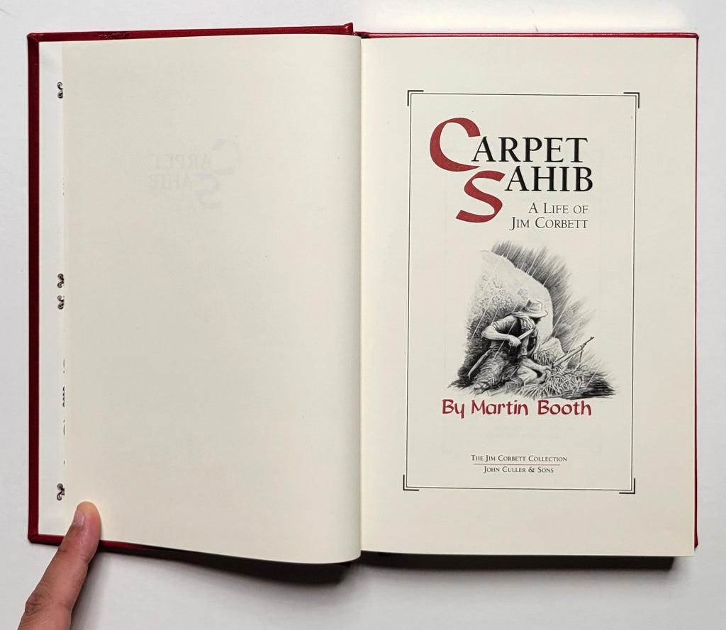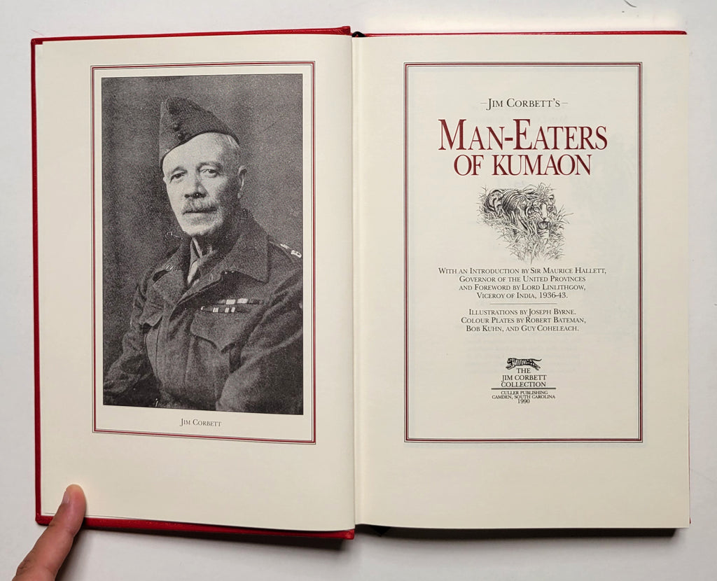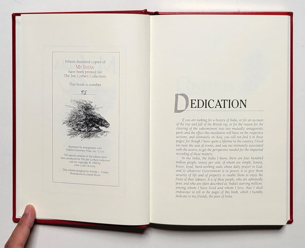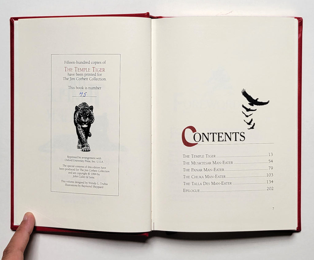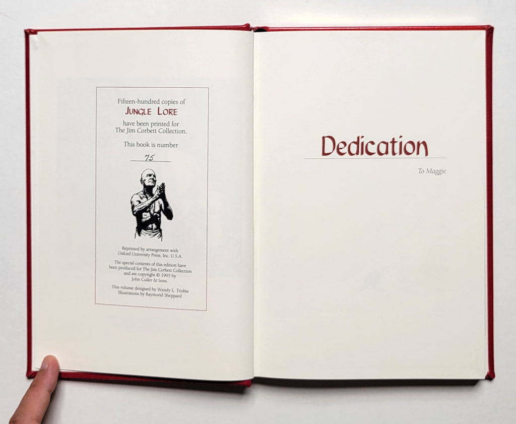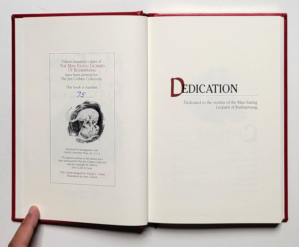 The Jim Corbett Collection. Six titles, five by Corbett and the sixth Martin Booth’s Carpet Sahib: A Life of Jim Corbett. The books by Corbett include My India, The Man-eating Leopard of Rudraprayag, Jungle Lore, The Temple Tiger, My India, and Man-Eaters of Kumaon. All bound in lovely red leather, with decorative endpapers, ribbon marker, raise hubs, and gilt on front cover and spine. A striking set from Culler Publishing. Limited, numbered edition of 1500 copies, all published in the first half of the 1990s. This is a matching number set with the number being 75. Very fine.  A spectacular set. $750.
