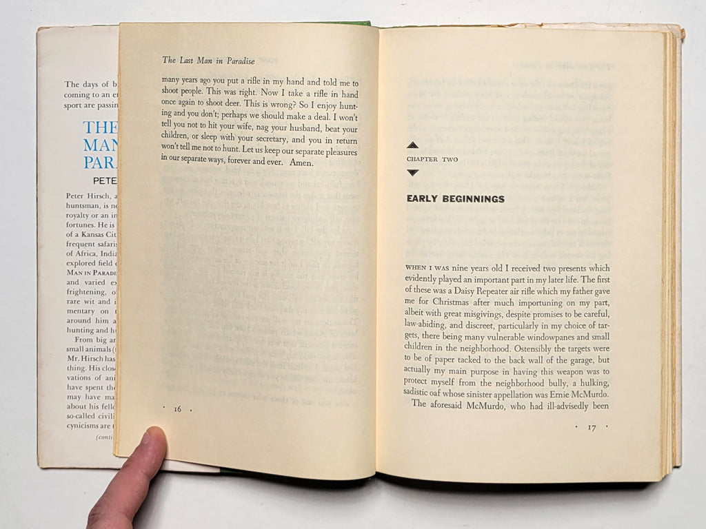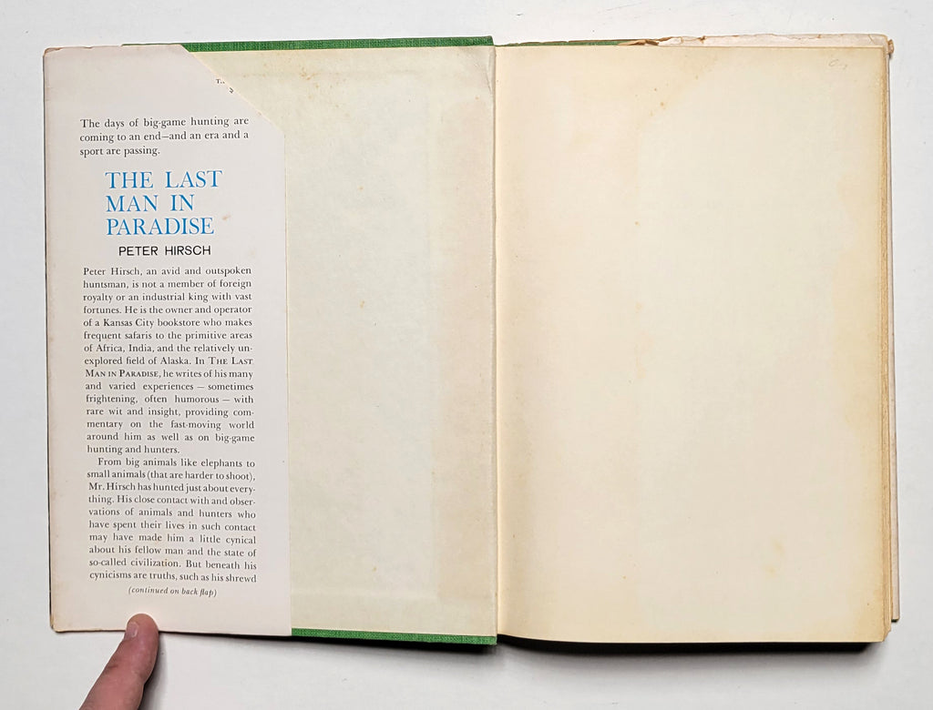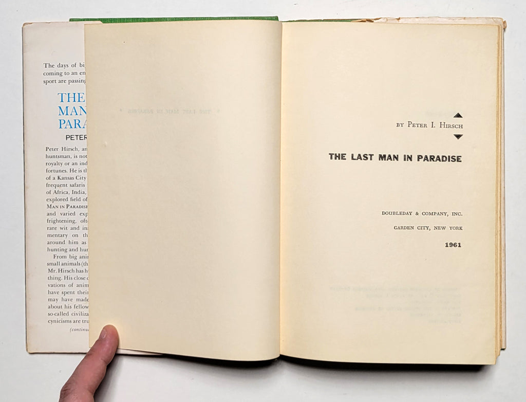 Peter Hirsch, The Last Man in Paradise. Garden City, NY: Doubleday & Co., 1961. Hardbound in price-clipped dust jacket. 1st edition. 240 pages. Illustrated. Book good; dust jacket poor. $18.