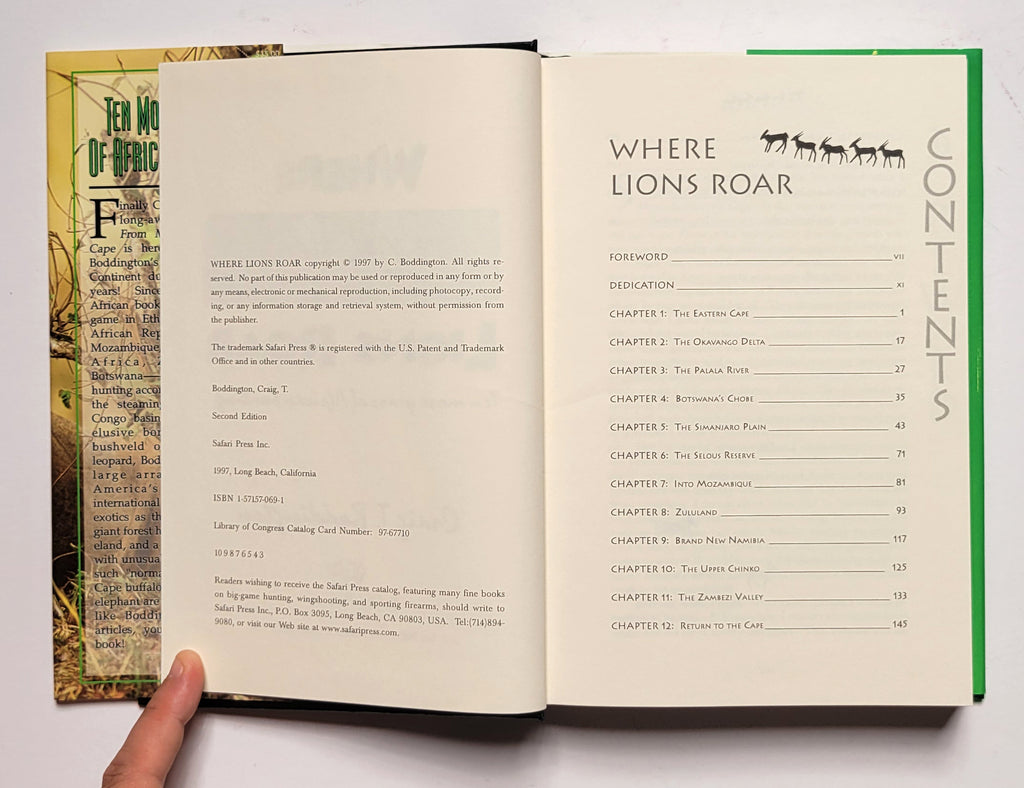 Craig Boddington, Where Lions Roar: Ten More Years of African Hunting. Long Beach, CA: Safari Press, 1997. 2nd edition. Hardbound in dust jacket. xii, 349 pages. Illustrated. Book and dust jacket about fine. $18.