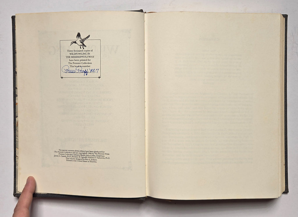 Eugene V. Connett, Wildfowling In The Mississippi Flyway. USA: The Premier Press, 1984. Leather-bound. Press proof #7 of 3000 copies printed. Part of the Premier Collection. In addition to the written story of the Western Hemisphere's most famous wildfowling grounds, this volume gives a pictorial history of oldtime gunning and an illustrated record of modern methods employed by duck and goose hunters from northern Canada to the Gulf of Mexico. $50